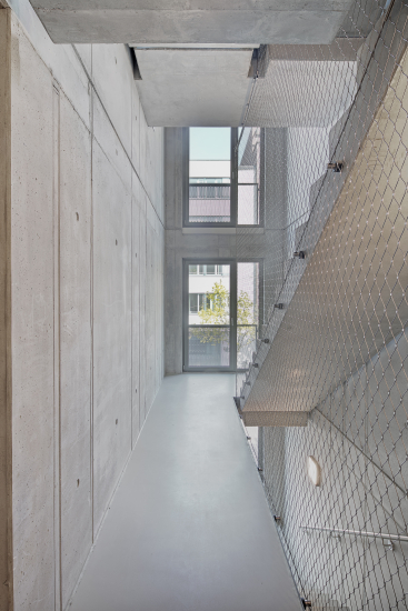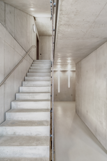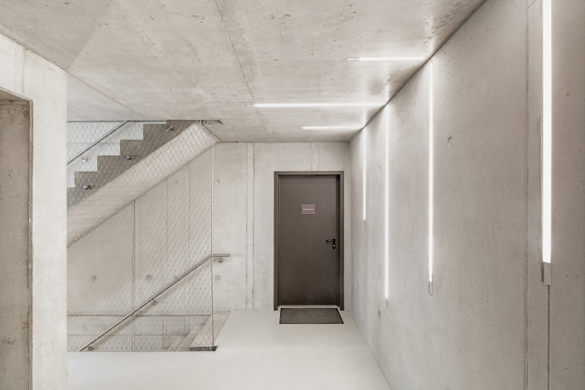 Auch im Inneren beeindruckt das Gebäude mit modernen Details: Sichtbeton mit integrierter Beleuchtung sowie ein stilvolles Netzgeländer im Treppenhaus setzen Akzente.
