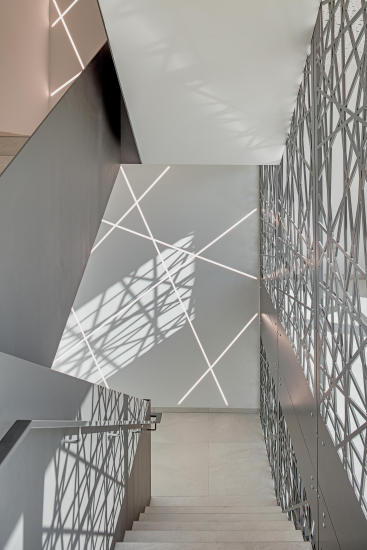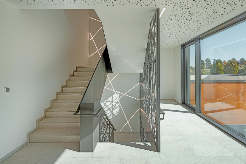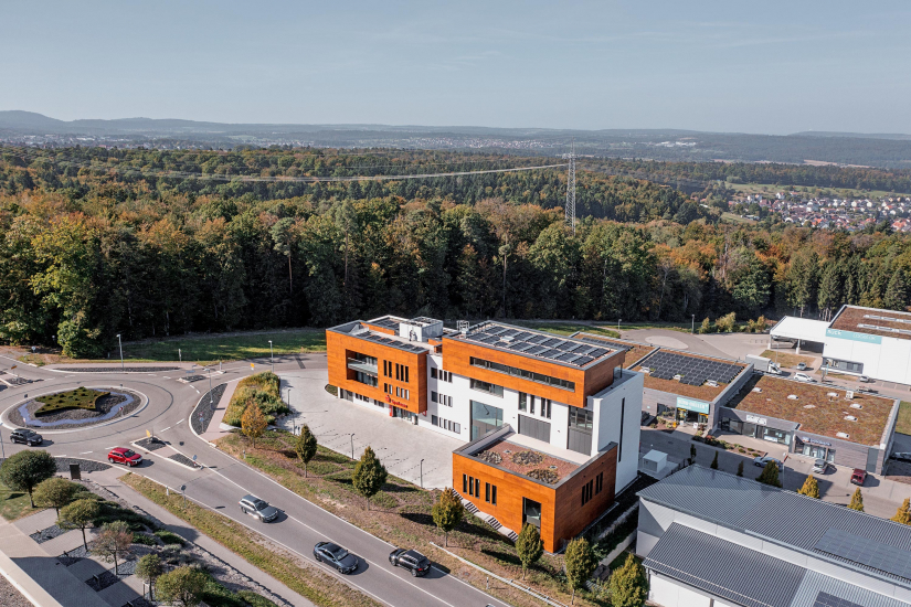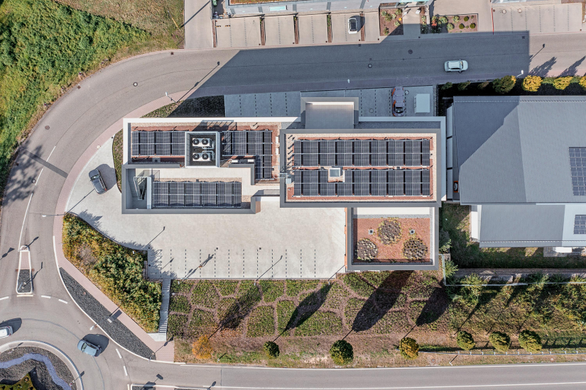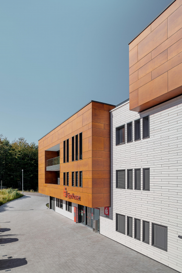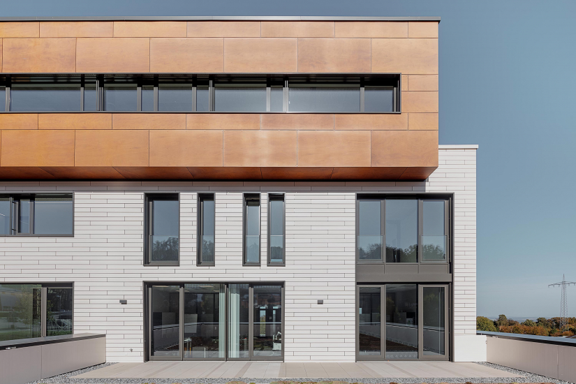 Das repräsentative Gebäude überzeugt durch eine hochwertige Fassade mit abwechslungsreichen Materialien und Farben. Große Verglasungen als horizontale und vertikale Fensterbänder sorgen für eine helle und offene Atmosphäre. Die hohe Energieeffizienz (BEG 40 EE) wird durch den Verzicht auf fossile Energieträger erreicht. Luft-Wasser-Wärmepumpen und eine Photovoltaikanlage auf dem Dach liefern die benötigte Energie.