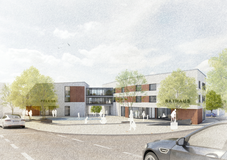 Der Winkelbau, der das Rathaus und das Pflegezentrum beherbergen wird, schafft eine neue Mitte für die Ortschaftsverwaltung. Das vom DRK betriebene Pflegeheim bietet Platz für 30 pflegebedürftige Menschen. Direkt angrenzend entsteht ein öffentlicher Dorfplatz, der für Veranstaltungen genutzt werden kann und den sozialen Austausch im Stadtteil fördert.