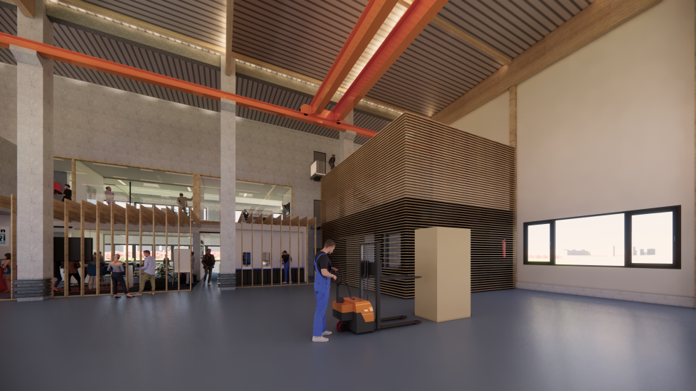 Die großzügige, lichtdurchflutete Halle wird drei Produktionslinien mit Verkehrswegen, Think Tanks und einer Kranbahn beherbergen. Mehrere Gänge verbinden die Halle direkt mit den Büro- und Konferenzräumen. Große Glasflächen schaffen Transparenz und fördern eine offene Arbeitsatmosphäre.